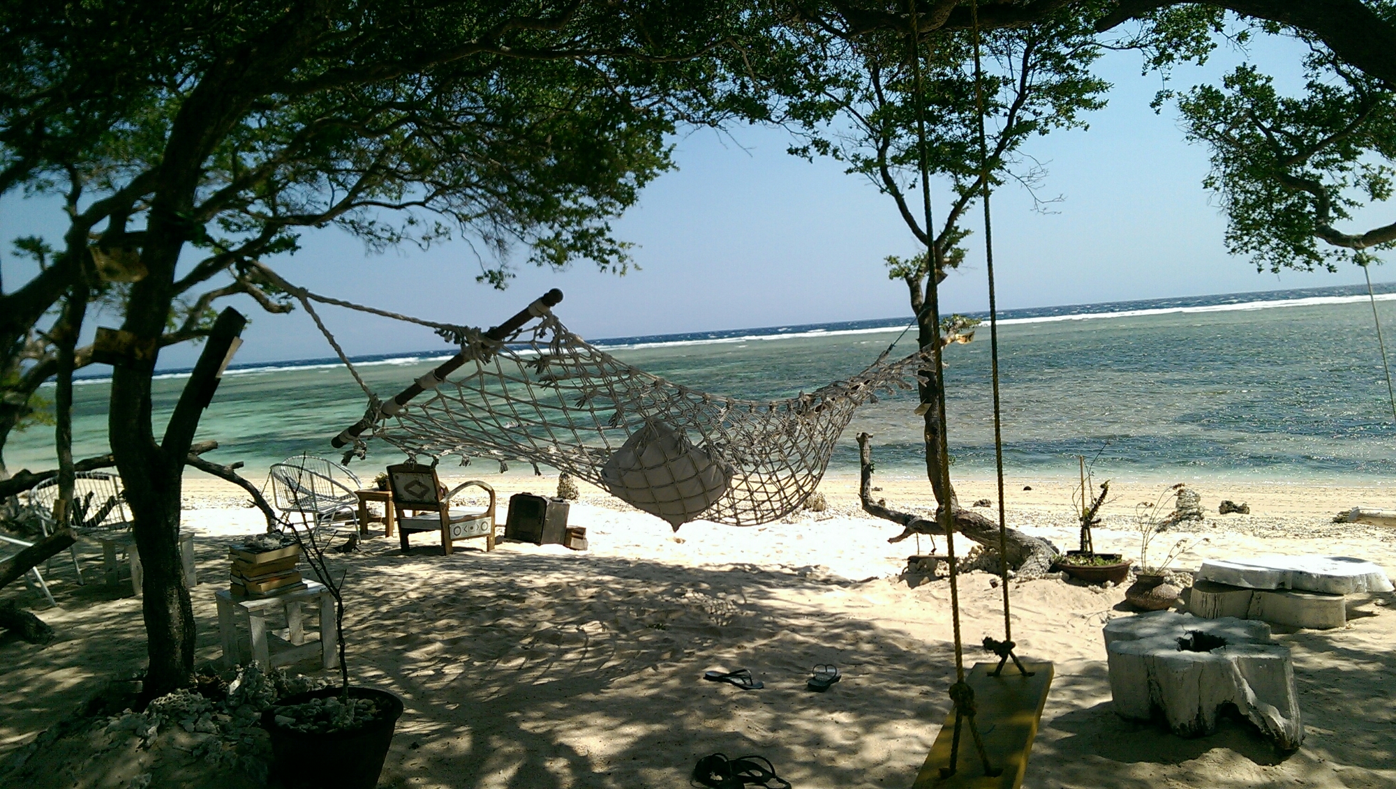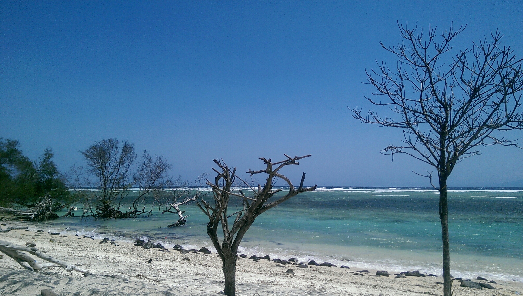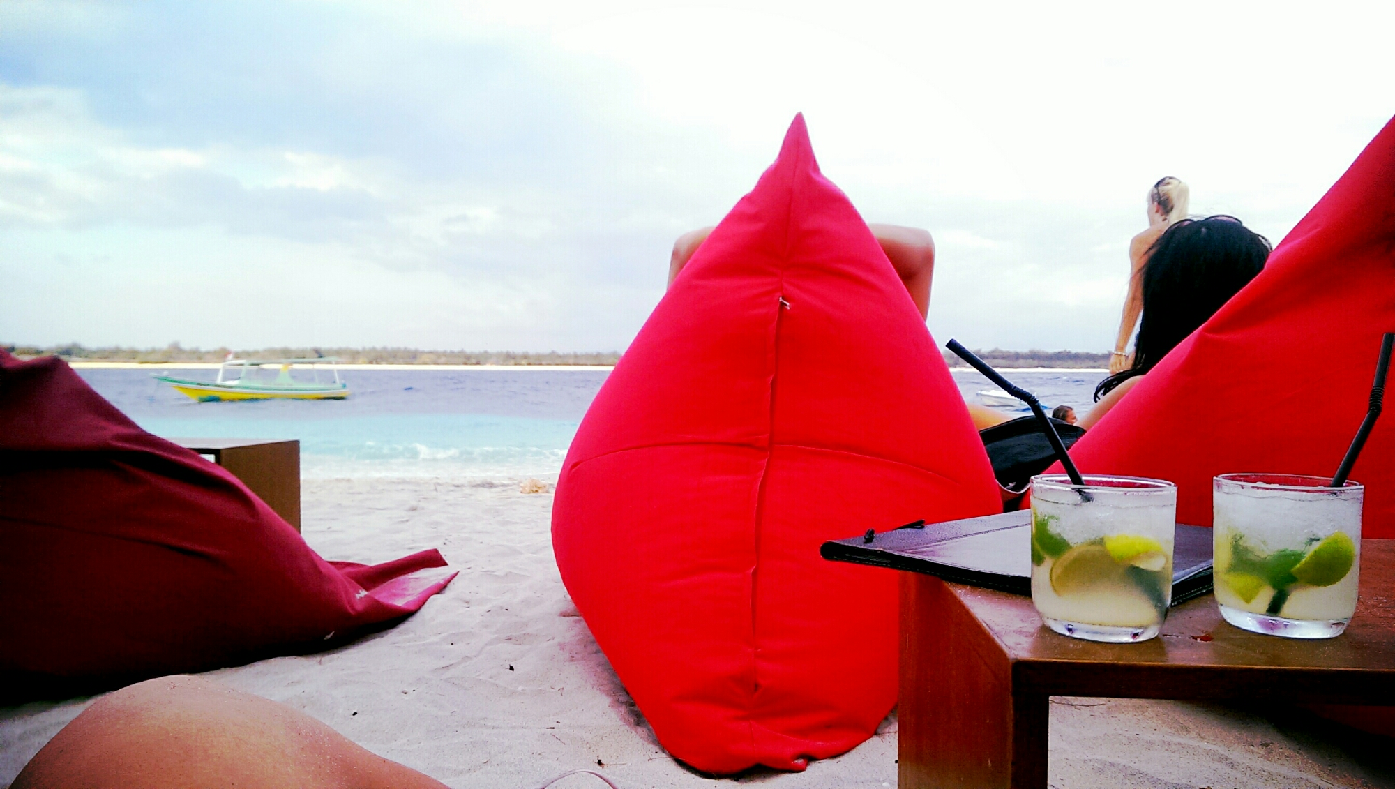 Vandaag ga ik terug naar Gili Trawangan en haal -voor de verandering- de openbare boot. Ik spreek met Sophie en Lianne af bij het strandtentje The Exile. Het bevindt zich aan de andere kant van het eiland en gezien je ook op dit eiland alleen ter paard, ter fiets of met de benenwagen kunt, huur ik een fiets. Mijn Google maps is iets van streek en kom langs plekken waar je ’s avonds (en overdag trouwens ook niet) niet graag wilt fietsen. Als ik palmbomen begin te zien en de zee hoor, duurt het het niet lang voordat ik bij de meiden ben.