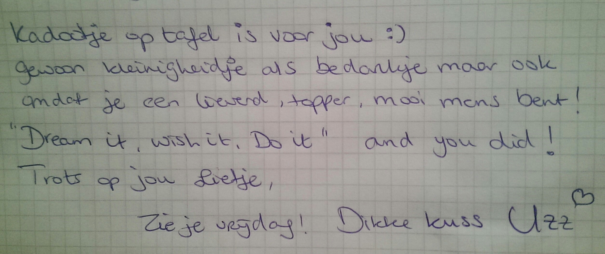 Na een reis van 18 uur kom ik aan op Schiphol en staan mijn ouders, zusje en schoonbroer mij op te wachten. Fijn om ze weer te zien! Thuis aangekomen in mijn Hobbitshuisje tref ik een bedankbrief aan van mijn lieve vriendin Uzma die tijdens mijn vakantie in mijn huisje heeft gewoond en sluit zij haar brief superlief af.