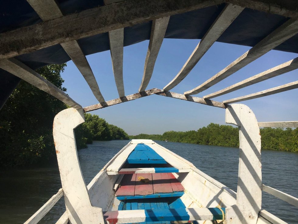 4. We rijden verder naar Lamin Lodge waar we gaan varen door de mangroven. We varen met drie man sterk -al peddelend- door de mangroven en zien verschillende vogels en krijgen te horen dat hier oesters worden gevangen. Alles wordt hergebruikt: de schaal wordt verbrand en gebruikt voor verf, cement en kippenvoer.