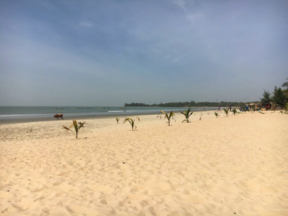 In ons resort ontmoeten wij een Belgisch stel, die al eerder naar Gambia zijn geweest en stellen voor om buiten het resort wat plekken te bezoeken. We nemen een taxi naar richting Bijilo Forest Park & Nature Trail (ook wel Monkey Park genoemd). Voordat we hier zijn, drinken we een drankje in het Senegambia Beach hotel. Dit hotel is gelegen in de zogeheten Senegambia (toeristen)strip: een beveiligde straat waar je als toerist dus veilig kunt flaneren, een hapje kan eten en een drankje kan doen. Het strand voor het hotel is grotendeels weggeslagen door wind en zee (erosie). Toch best wel heftig en confronterend om te zien wat er gebeurd met onze aarde.